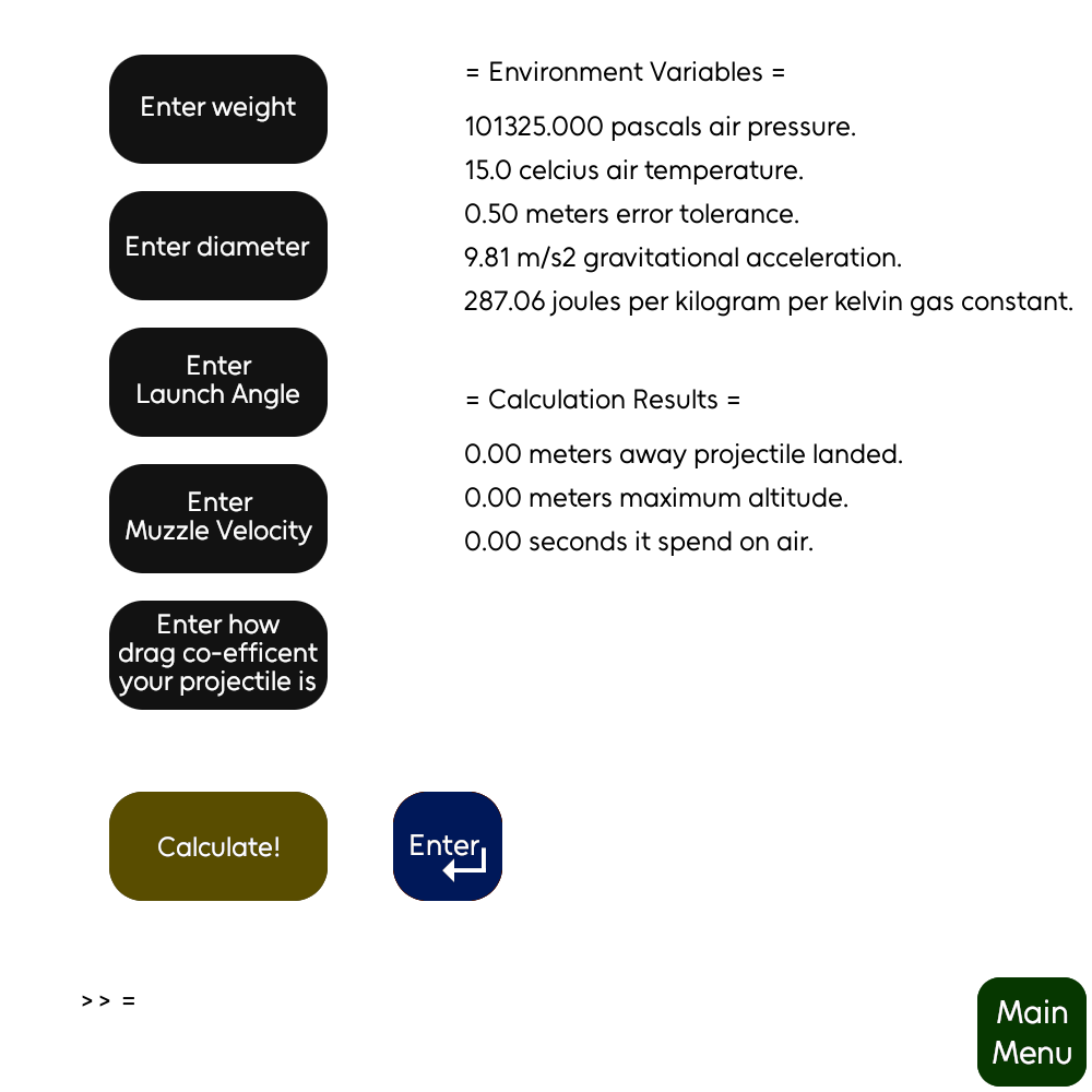 Weight, diameter, launch angle(1), muzzle velocity, drag coefficient(aerodynamic)